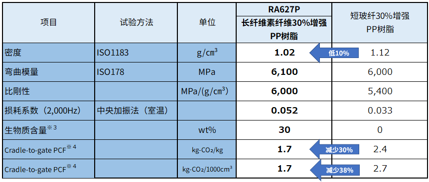 PLASTRONⓇ RA627P是一种使用了PCF(产品碳足迹)非常小的再生纤维素纤维来制造的长纤维纤维素增强PP树脂,其PCF(产品碳足迹)※4比短玻纤30%增强的PP树脂低约30%(以单位材料体积比较则低约38%)。